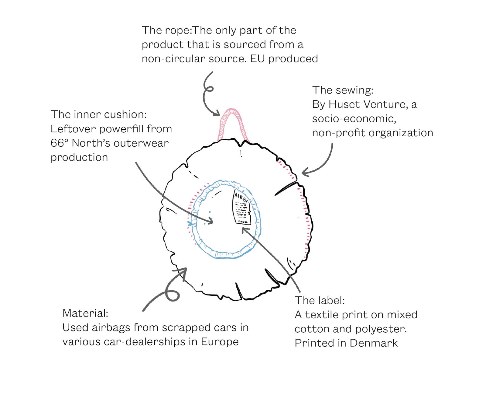 The Airbag project started with FÓLK asking the designers at Studio Flétta to visit a local car part sale and create a design from materials that were not currently resold or reused by the dealership. Flétta found the airbags among the waste in the car part dealership and proposed the idea of creating beautiful upcycled pillows from the waste.