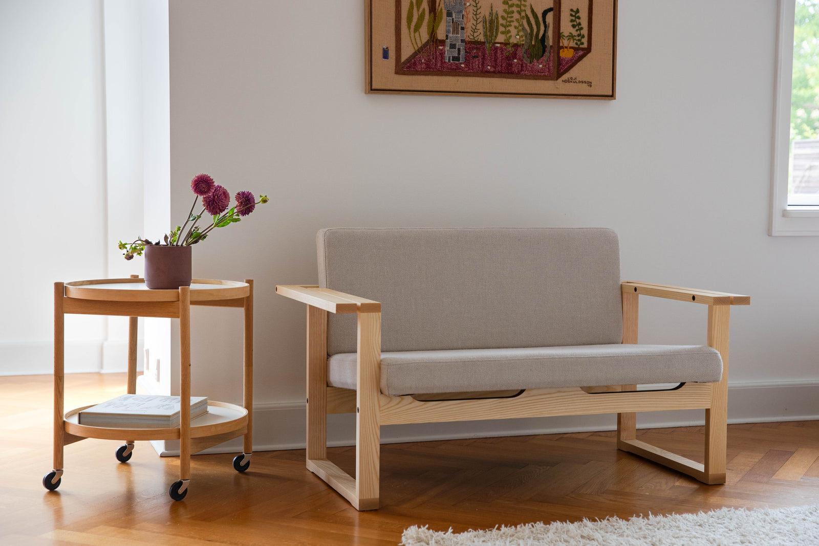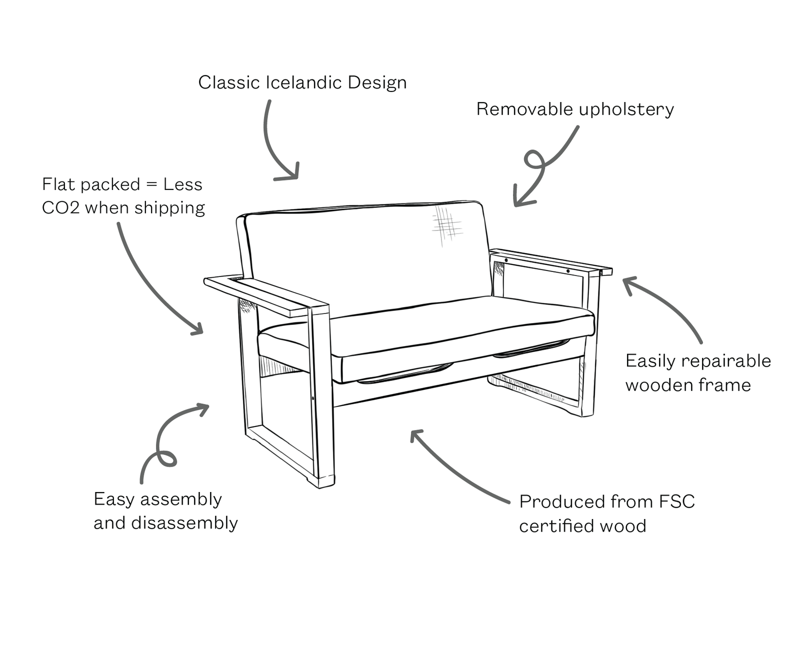 All furniture parts are separable. Handle with care. Textile is dry cleanable. Clean wood with a damp, soft cloth. Gently sand scratches and re-oil as needed. Learn more in the product passport.