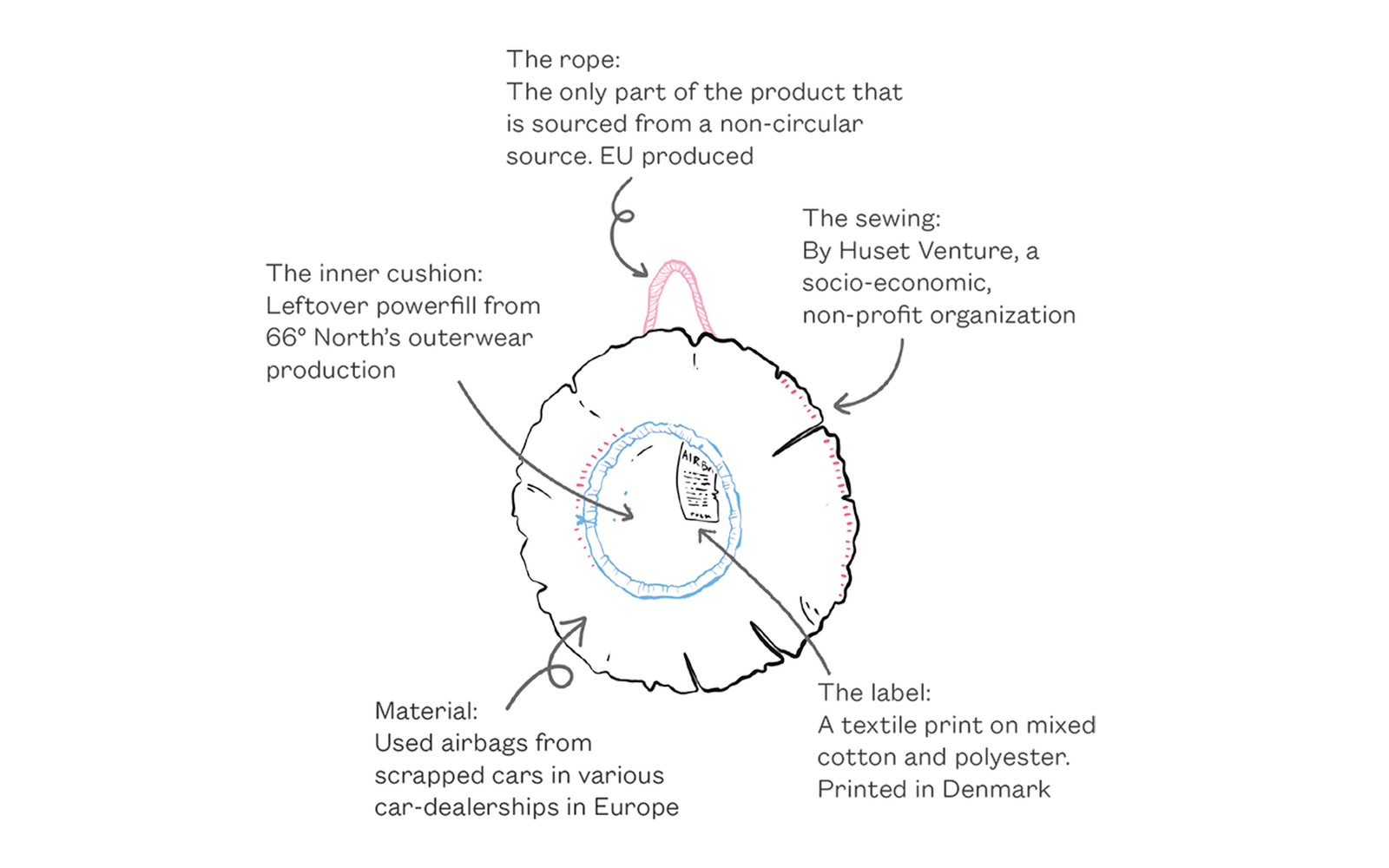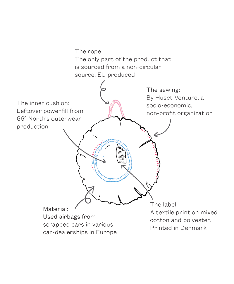 The inner cushion is made at a Huset Venture. The textile itself is leftover textile in various compositions which the Venture house receive for free from many different external companies. The textile therefore comes from different sources like bedlinen, curtains from IKEA or banner-textile from local kayaking clubs.