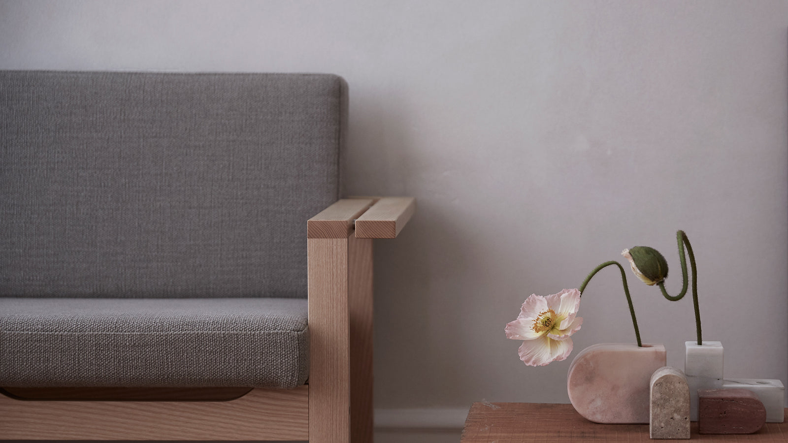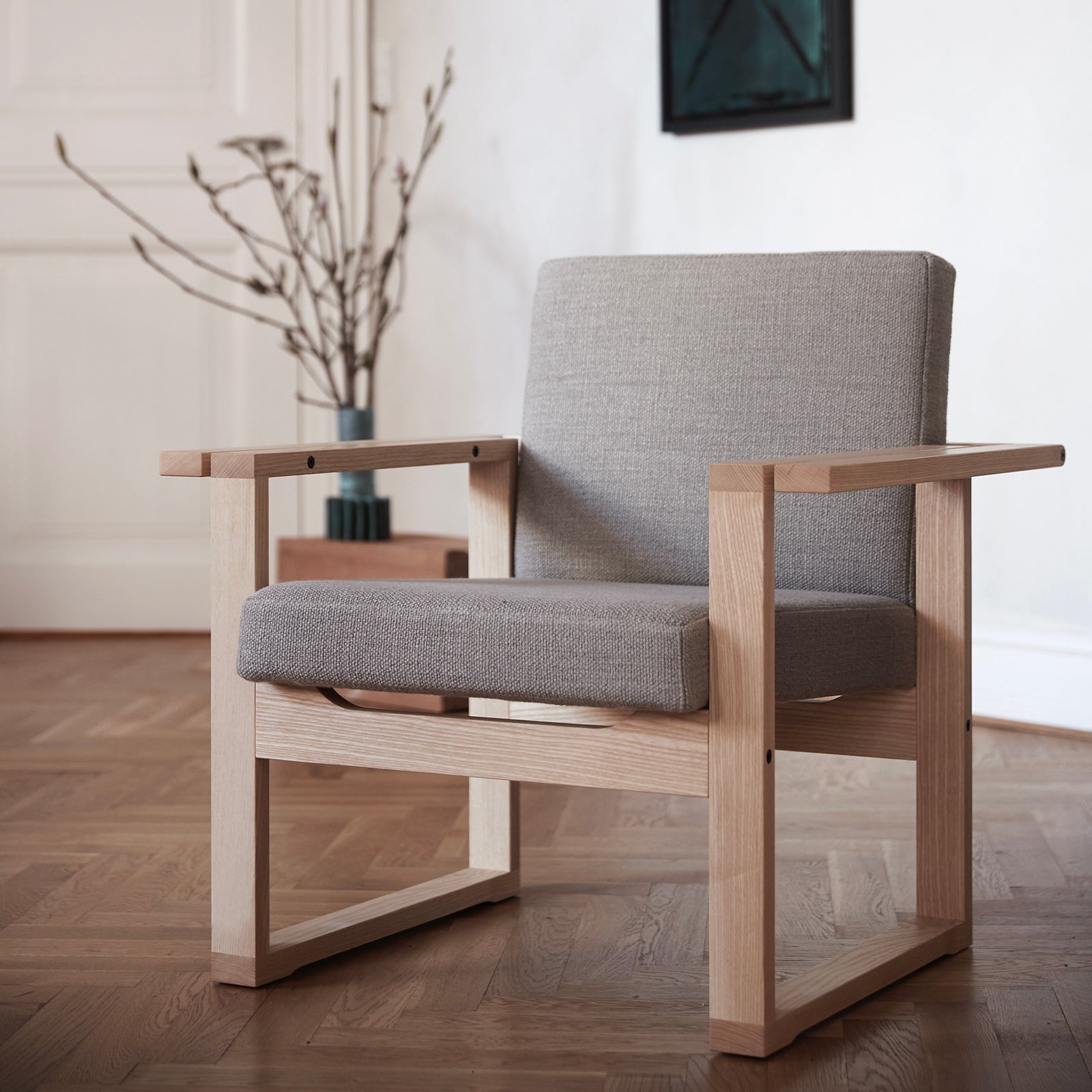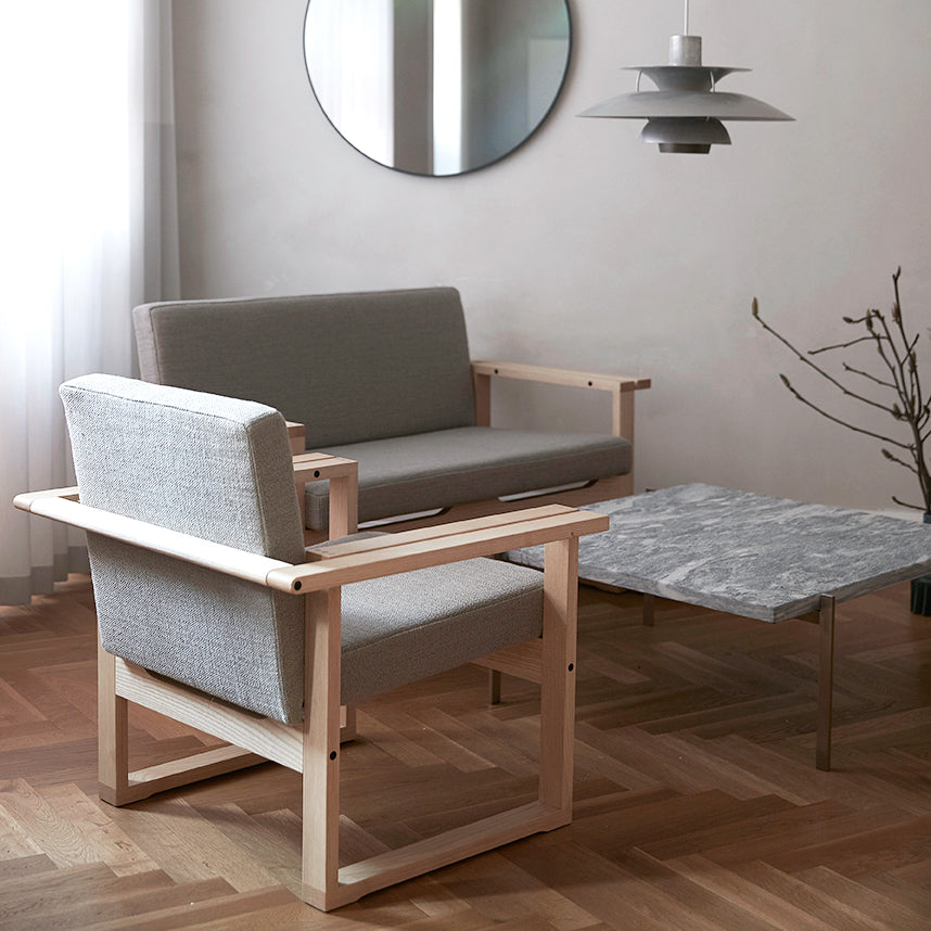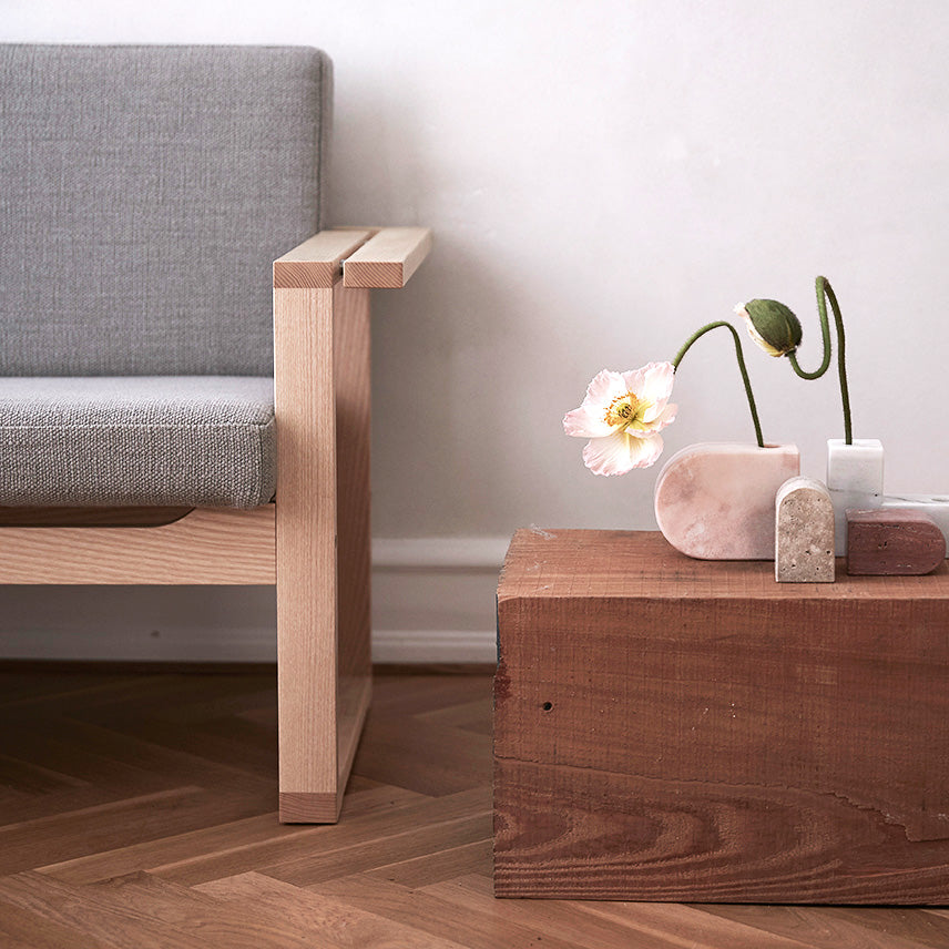 The wooden frame of the sofa and chair is produced from FSC certified ash and oak wood by a skilled cabinetmaker. Choose between Ash, Oak and Black tinted Oak.