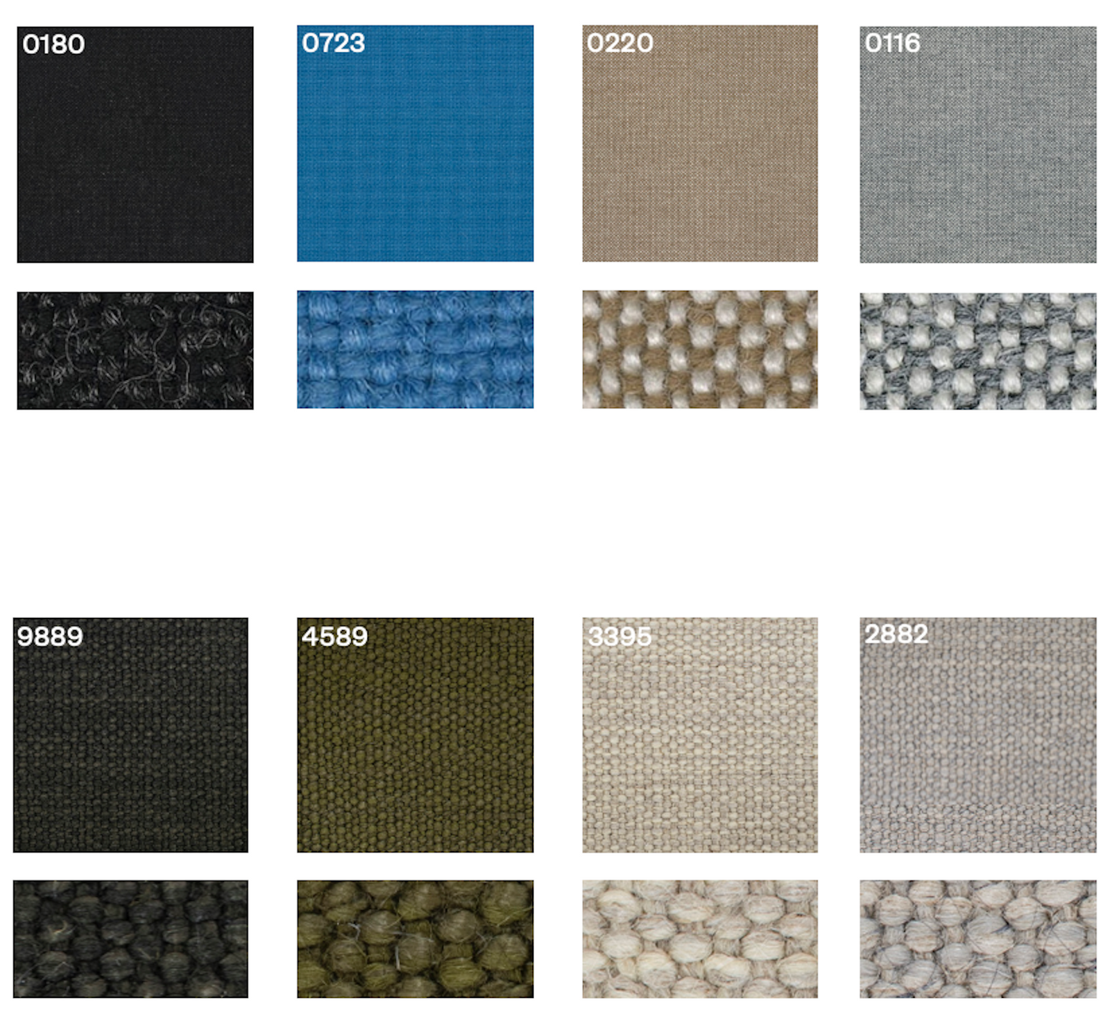 The upholstery textile is from Danish textile company Kvadrat, and is produced in Norway, using wool from New Zealand, Norway and the Great Britain. The textile, Hallingdal 65, conforms to EU Ecolabel.