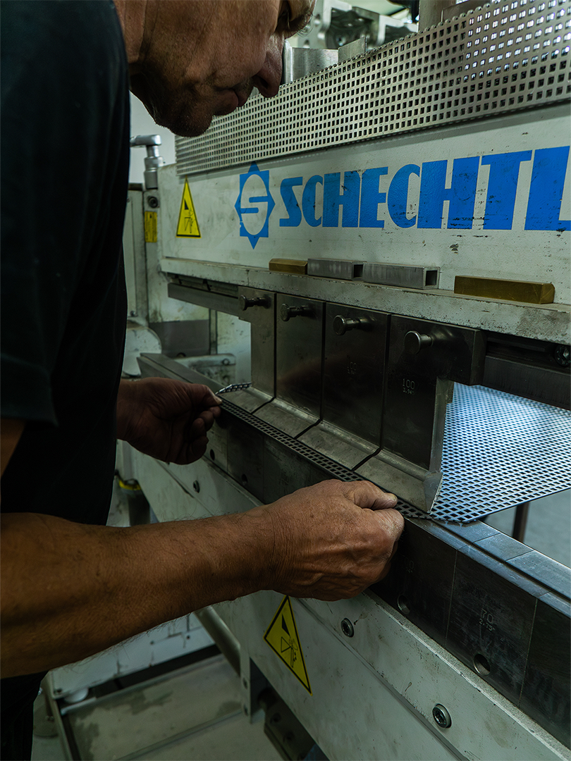We saw beauty in a simple sheet of perforated steel, once destined for ventilation systems, and imagined it in a completely new way.